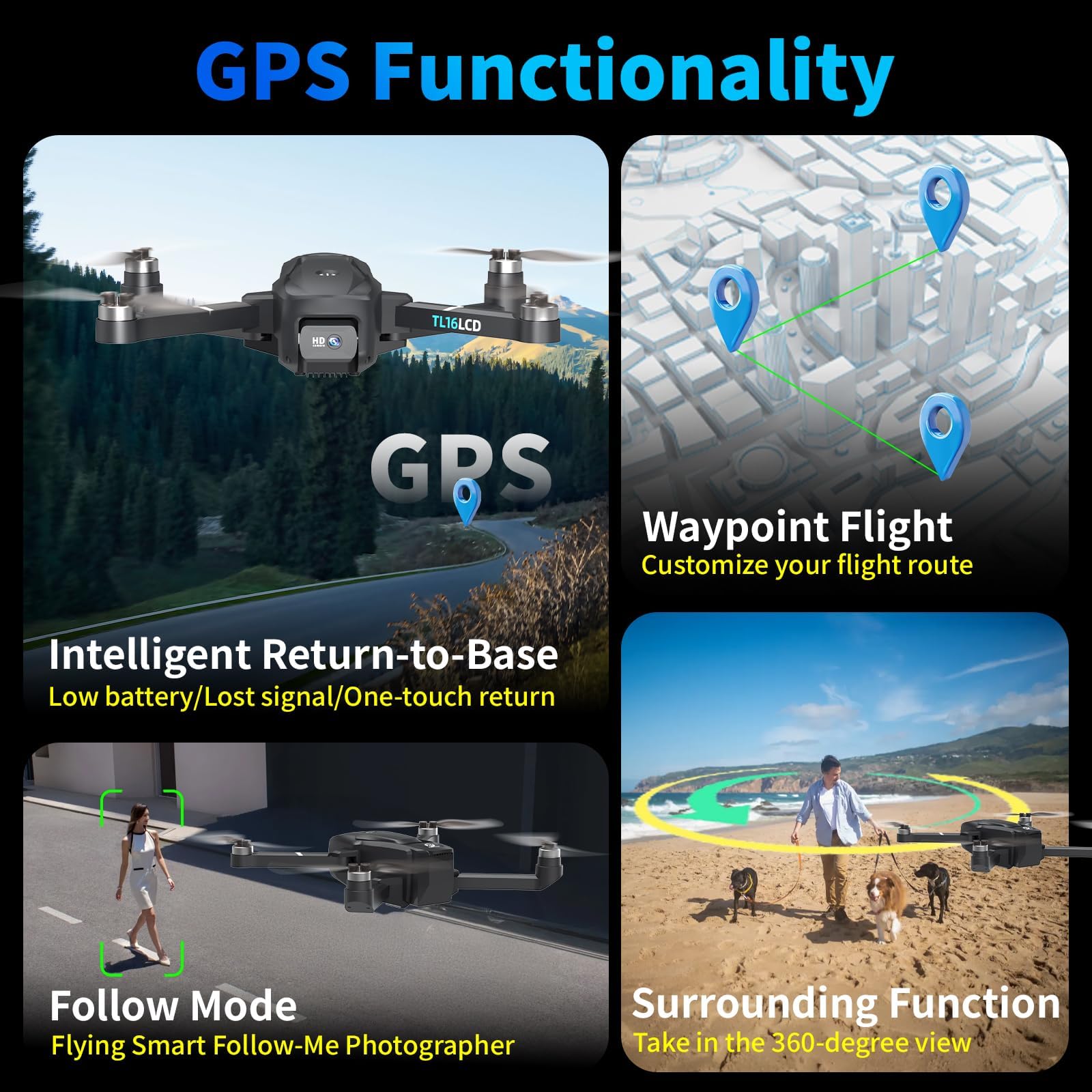 - Drone GPS per adulti: Progettati per utenti esperti, questi droni con fotocamera 4K per adulti sono dotati di funzioni GPS essenziali: ritorno automatico in caso di batteria scarica o perdita di segnale, blocco della posizione GPS. Questo affidabile drone con fotocamera rimane controllabile indipendentemente dall'ambiente esterno, soddisfacendo le esigenze fotografiche di livello professionale.
